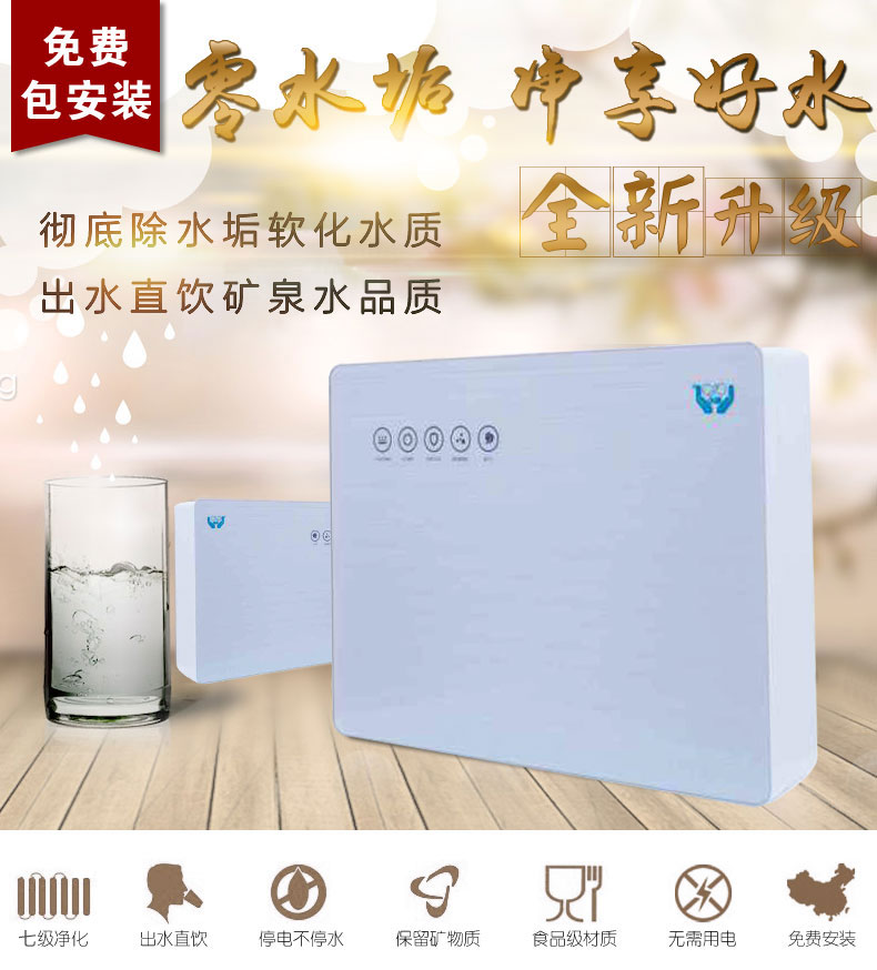 告别水垢——祐心零水垢净水器,七级滤芯,过滤自来水中的泥沙铁绣、去除重金属污染源、转化软水、滤除微粒悬浮物、抑菌活化,让您和家人喝上健康的直饮水。
