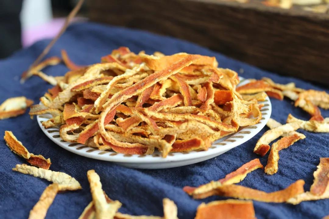 陈皮性温、味辛苦,有“理气健脾、燥湿化痰、止咳降逆”的功效,可用于治疗脾胃气滞、脘腹胀满、消化不良、食欲不振、咳嗽多痰等。